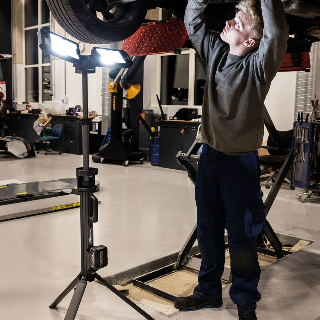 Scangrip Tower 5 connect on kätevä työmaan valaisin kolmijalalla ja kahdella valonheittimellä, jotka tarjoavat jopa 5000 lumenia
