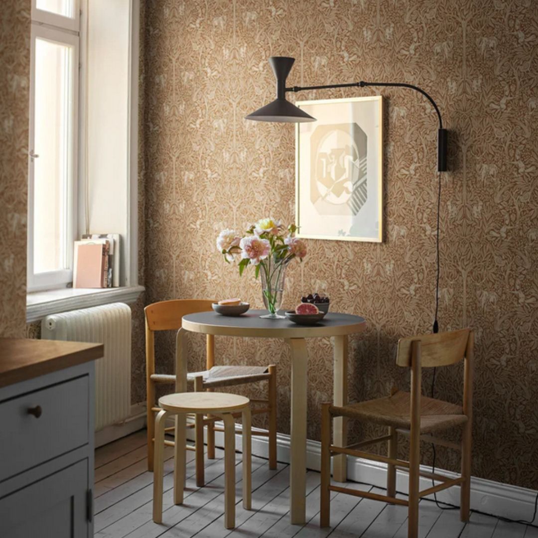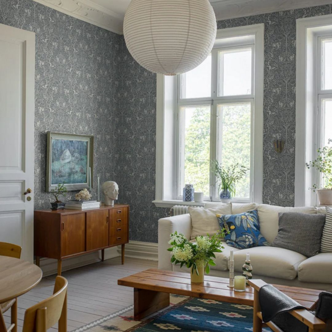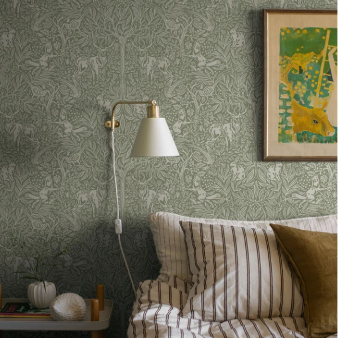 Siinä näkyvät selkeästi myös Arts & Crafts -vaikutteet ja keskiaikaisten gobeliinien kuvakieli. Seljan tiheä lehvästö muodostaa etäältä levollisen ja yhtenäisen pinnan, mutta läheltä katsottuna kuosista löytyy metsän eläimiä. Vehreä tapetti sopii niin isoille kuin pienillekin!