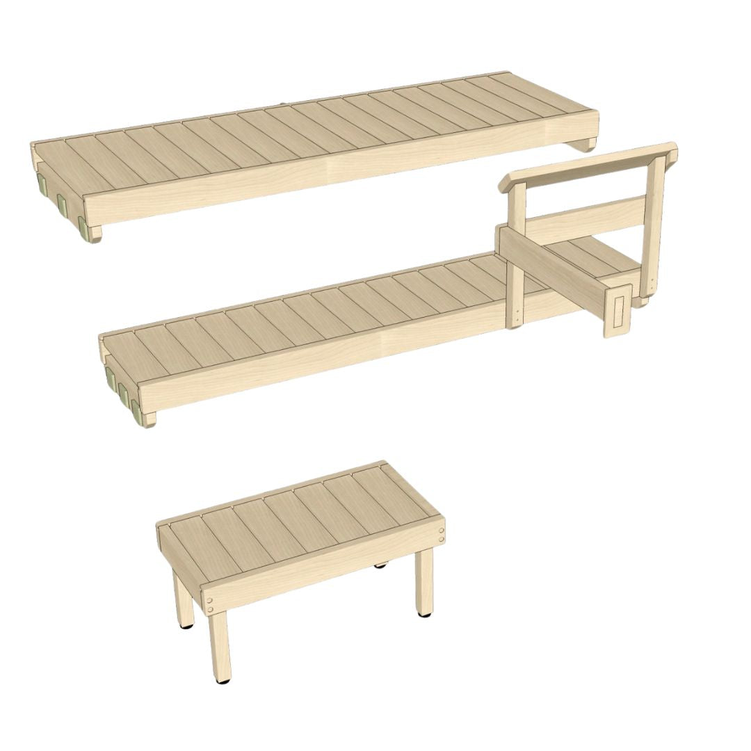 Laudetoimitukseen sisältyy ylä- ja alalaude, kiuaskaide, jakkara ja kannatinpuut. Materiaalivaihtoehdot ovat tervaleppä, lämpöhaapa ja kuusi.