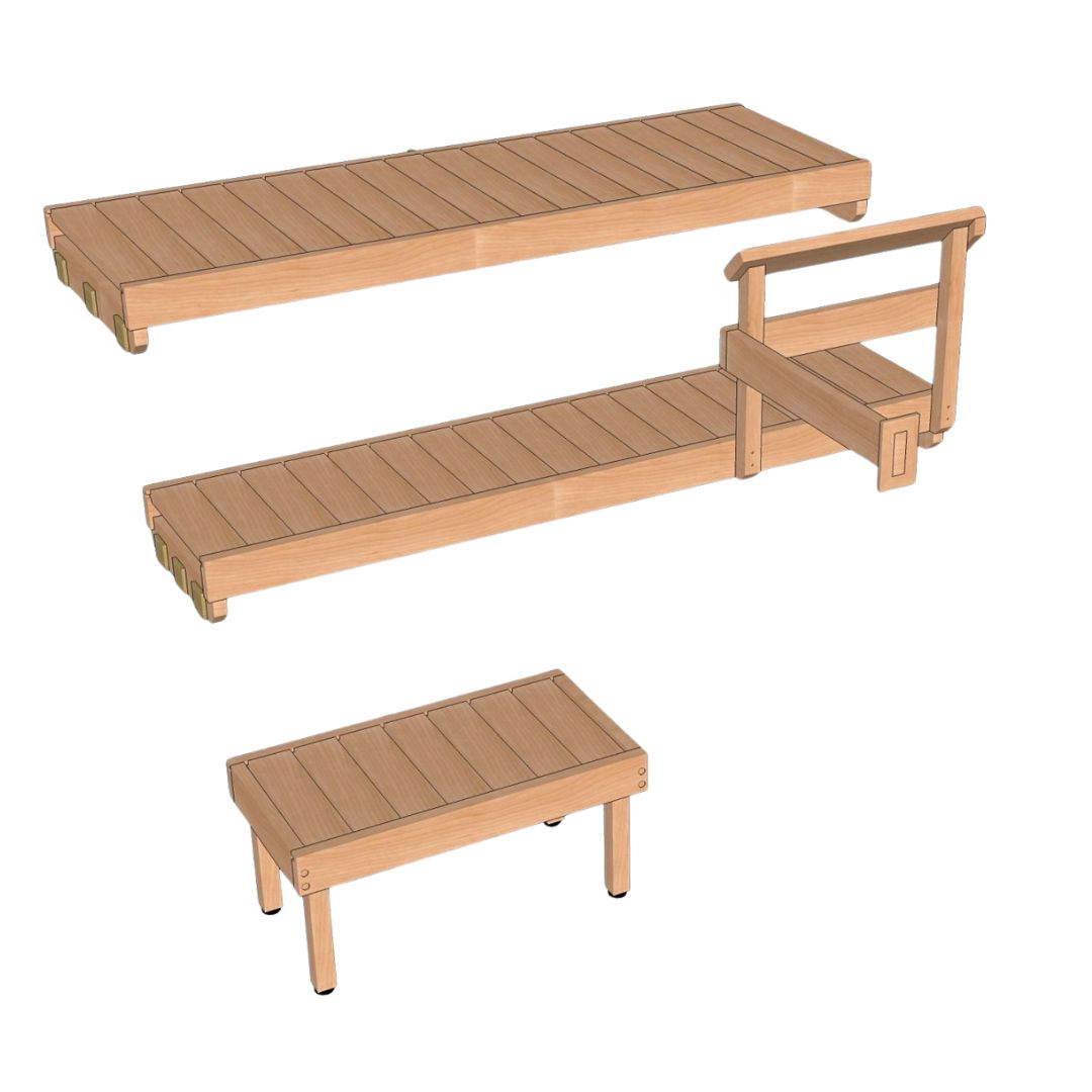 Laudetoimitukseen sisältyy ylä- ja alalaude, kiuaskaide, jakkara ja kannatinpuut. Materiaalivaihtoehdot ovat tervaleppä, lämpöhaapa ja kuusi.
